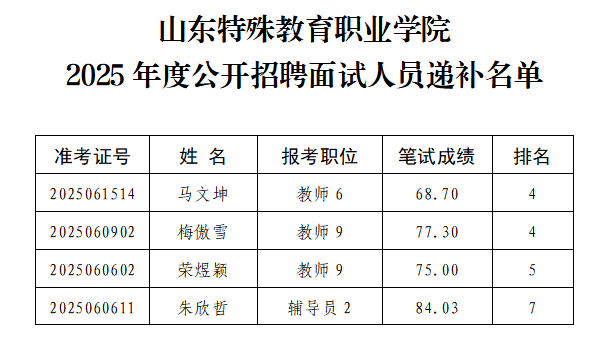 根据《kaiyun开云官方在线入口2025年度公开招聘人员公告》规定:“面试现场资格确认的时间、地点通过学院网站另行通知,逾期不到者,视为自动放弃应聘。经审查不具备报考条件的,取消其面试资格。因放弃或取消资格造成的空缺,从达到笔试合格分数线的应聘人员中按笔试成绩依次递补,并面向社会公布。”现将kaiyun开云官方在线入口2025年度公开招聘面试人员递补名单予以公布。
