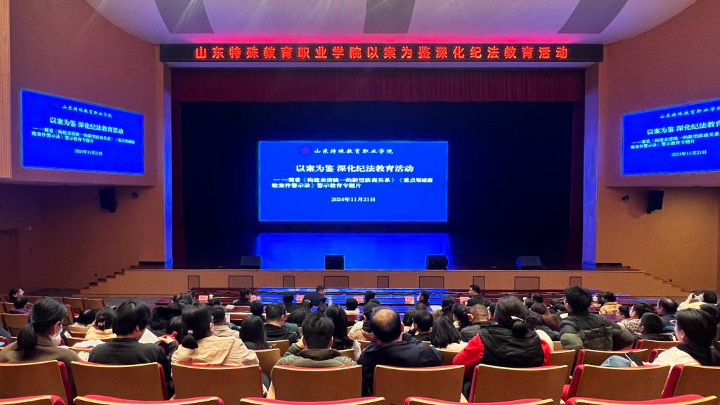 11月21日下午,学院组织党员在礼堂观看警示教育片《构建亲清统一的新型政商关系》《重点领域腐败案件警示录》,为广大党员干部敲响警钟。
