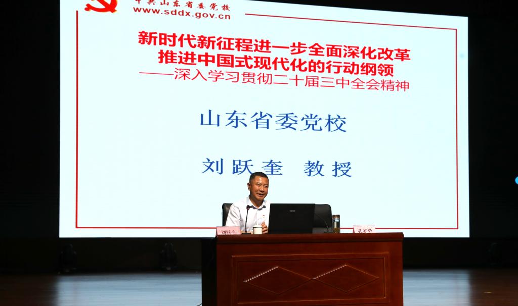 报告会上,刘跃奎教授以“新时代新征程进一步全面深化改革 推进中国式现代化的行动纲领——深入学习贯彻二十届三中全会精神”专题进行宣讲,围绕“全面深化改革、推进中国式现代化的重大意义和总体要求”“以经济体制改革为牵引,全面部署各领域各方面的改革”“提高党对进一步全面深化改革、推进中国式现代化的领导水平”三个方面,完整系统全面地阐释了党的二十届三中全会的精神实质和理论内涵,并紧密结合山东省情及高等教育、职业教育等领域改革实际,对进一步全面深化改革的指导思想、重大原则、目标任务、方法策略作出了细致解读。