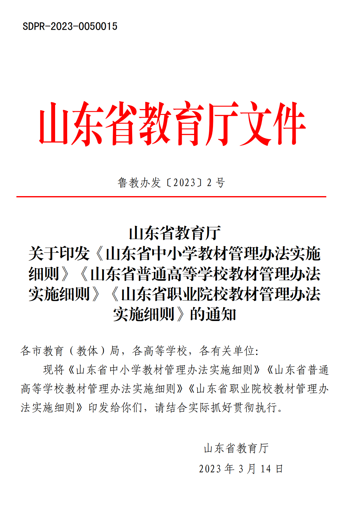 山东省教育厅关于印发《山东省中小学教材管理办法实施细则》《山东省普通高等学校教材管理办法实施细则》《山东省职业院校教材管理办法实施细则》的通知