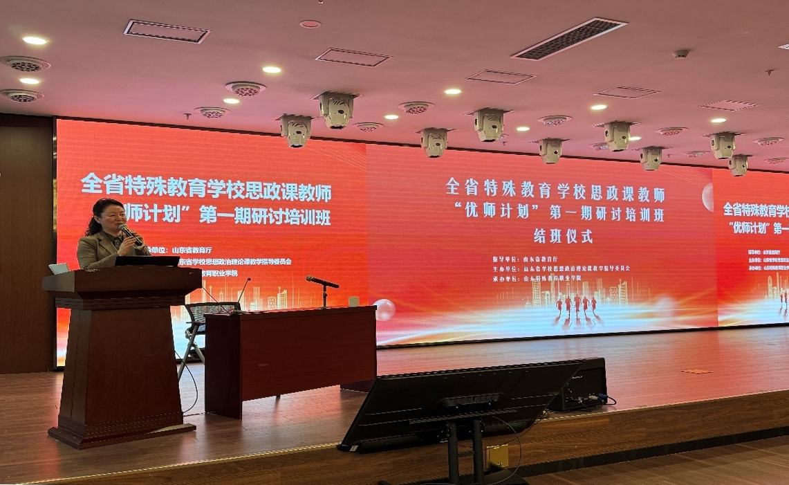 结班仪式上,山东省特教思政课分教学指导委员会主任委员、学院思政部主任张睿全面回顾了培训以来专家授课的核心内容和精髓,深刻阐述了本次研讨培训班举办的目的和重要意义,表示希望所有同仁能够并肩作战、携手共进,共同推动特殊教育思政课及特殊教育事业内涵式高质量发展。