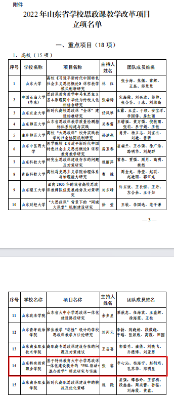 近日,山东省教育厅公布了2022 年山东省学校思政课教学改革项目立项名单。经各市各高校推荐、资格审核、专家评审和社会公示等环节,省教育厅研究确定了 83 项立项项目,其中,重点项目 18 项、一般项目 48 项、专题项目 17 项。