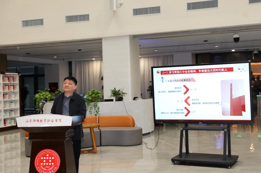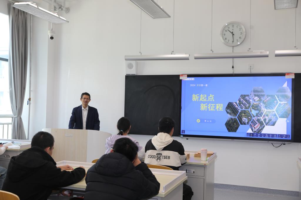 杨磊以《踏上征程 拥抱未来——学习贯彻党的二十届三中全会精神,开启人生新篇章》为题进行讲授。他向同学们传授了宝贵的经验和思考,指出大学不仅是踏上人生新征程的起点,更是成长成才的关键时期。随后,对党的二十届三中全会精神进行了解读,并结合学院发展的昨天、今天和明天,引领同学们把握时代发展大势,鼓励同学们立足所学专业、结合个人兴趣和特长,科学制定大学阶段的发展规划。最后,嘱咐同学们积极学习身边的榜样事迹,厚德自强、修技立身,以青春之我,为祖国建设添砖加瓦。