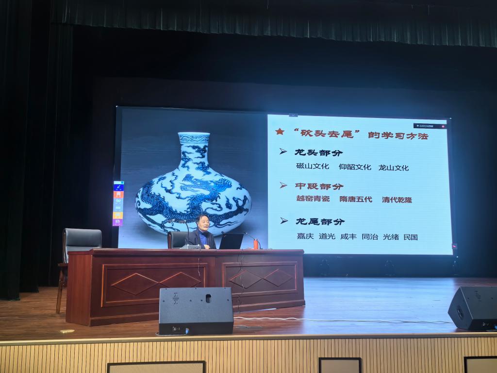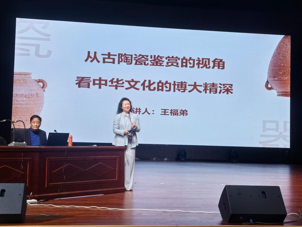 王福弟老师以“从古陶瓷鉴赏的视角,看中华文化的博大精深”为题,围绕“为什么要研究中国古陶瓷文化”“古陶瓷文化的种类”“怎样研究中国古陶瓷文化”三部分结合具体实物展开详细叙述。
