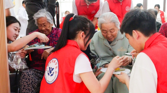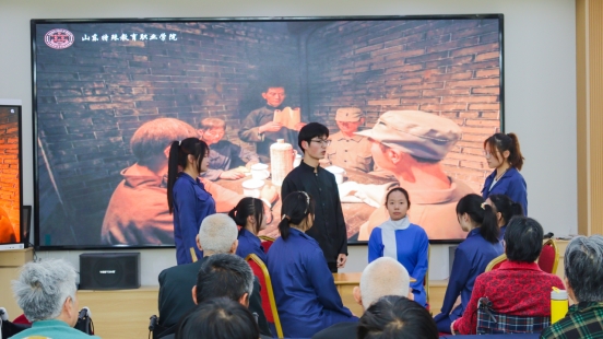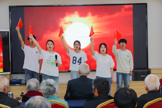 在马山敬老院,特殊教育系“青暖桑榆”志愿服务队与老人们同唱《我和我的祖国》《团结就是力量》等歌曲,唤醒大家的红色记忆;与大家共读《红岩》,并将书中精彩片段以话剧形式进行演绎,同学们以真挚的感情、精彩的对白、精准的人物形象刻画,让现场观众置身阅读盛宴,沉浸式体会革命先辈们的坚定信仰与大无畏精神;与社区老人一起做团扇、聊家常,现场氛围其乐融融,共筑红色基因的传承梦。