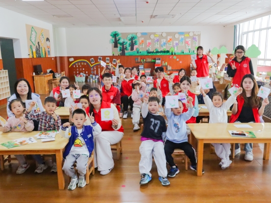 在北汝幼儿园,特殊教育系“护苗计划”的志愿者们创新形式,打破传统阅读边界,通过《谁咬了我的大饼》《我的幸运一天》绘本表演,用生动形象的语言和动作带领孩子们体验“沉浸式阅读”,与孩子们一同制作书签,在“玩书、做书、演书”的过程中感受读书乐趣,共筑乐享阅读的成长梦。