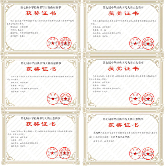 在省教育厅主办的第七届中华经典书写大赛山东赛事中,学院特殊教育系5名学子喜获佳绩,其中2024级特殊教育一班王锡钰、田心蕊获粉笔类师范院校学生组一等奖,2023级特殊教育一班扈瑶涵获硬笔类大学生组二等奖,2024级特殊教育二班李萱获毛笔类大学生组优秀奖,艺术设计系教师宋建红获优秀指导教师奖。