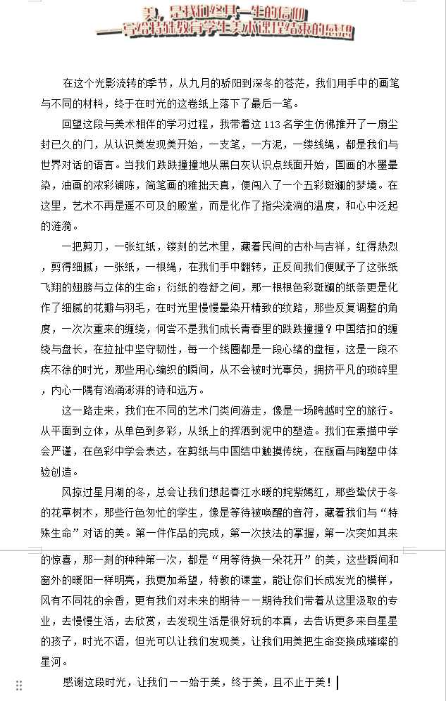 本次展览的序言由指导教师亲笔撰写。序言中,教师回顾了指导学生创作的历程,肯定了学子们在艺术学习中的努力与进步,字里行间满含对特殊教育学子的期许与关爱,为展览增添了浓厚的育人温度。
