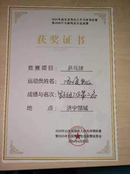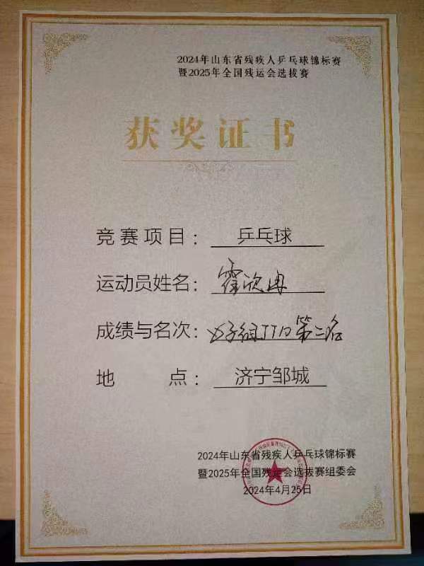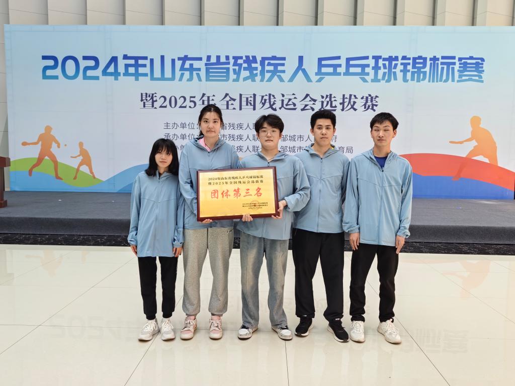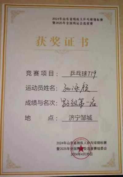 4月24日,2024年山东省残疾人乒乓球锦标赛暨2025年全国残运会选拔赛在邹城市开赛,我系肢体障碍学生孙泺颜获男子TT9冠军、霍欣冉获女子TT10亚军、冯俊凯获男子TT8亚军。