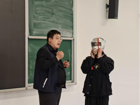 活动首站设在三教506教室。系全体同学集中观看消防安全宣传片,影片结合校园实际,重点对肢体障碍、听障等特殊群体的逃生步骤进行了细致讲解与演示。工作人员现场示范消防面罩使用方法,并邀请同学上台亲身体验,确保人人掌握防护技能。