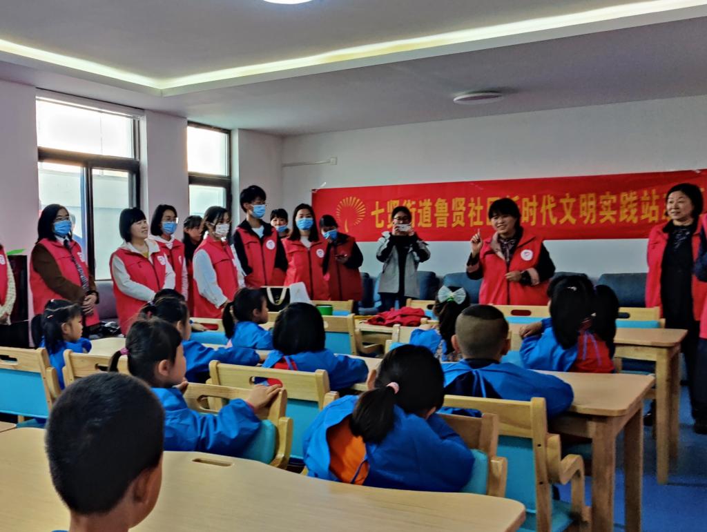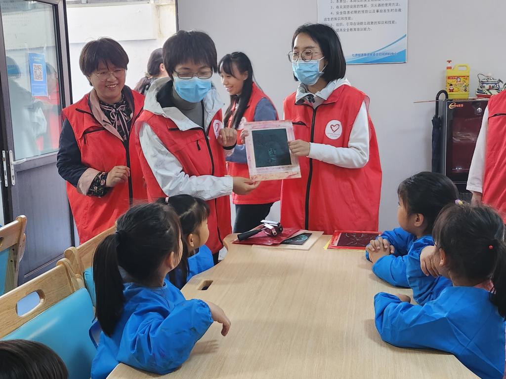综合三党支部志愿者们与鲁贤社区居民、七贤实验幼儿园师生讲解了非物质文化遗产保护与传承的意义。
