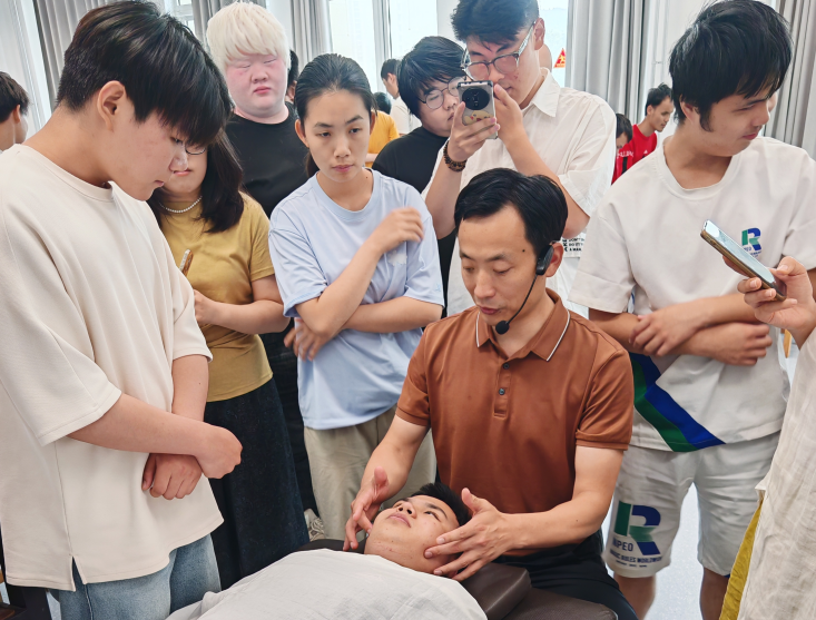 作为从校园走向国际舞台的典范,王俊以 “手法即生命” 为核心,分享了他在盲人推拿领域的专业知识和宝贵经验。他通过互动式的讲座、小组讨论及一对一辅导等形式,与同学们们进行了深入交流。培训内容涵盖了从手法规范到职场适应等多个方面,旨在帮助学生们更好地规划自己的学习生涯和个人发展路径。中医康复教研室李娜老师表示:“邀请我们的优秀毕业生回到母校担任客座教授,是我们加强实践教学环节、提升人才培养质量的一项重要举措。希望通过这样的活动,能够激励更多的同学努力学习,早日成为社会的栋梁之才。”