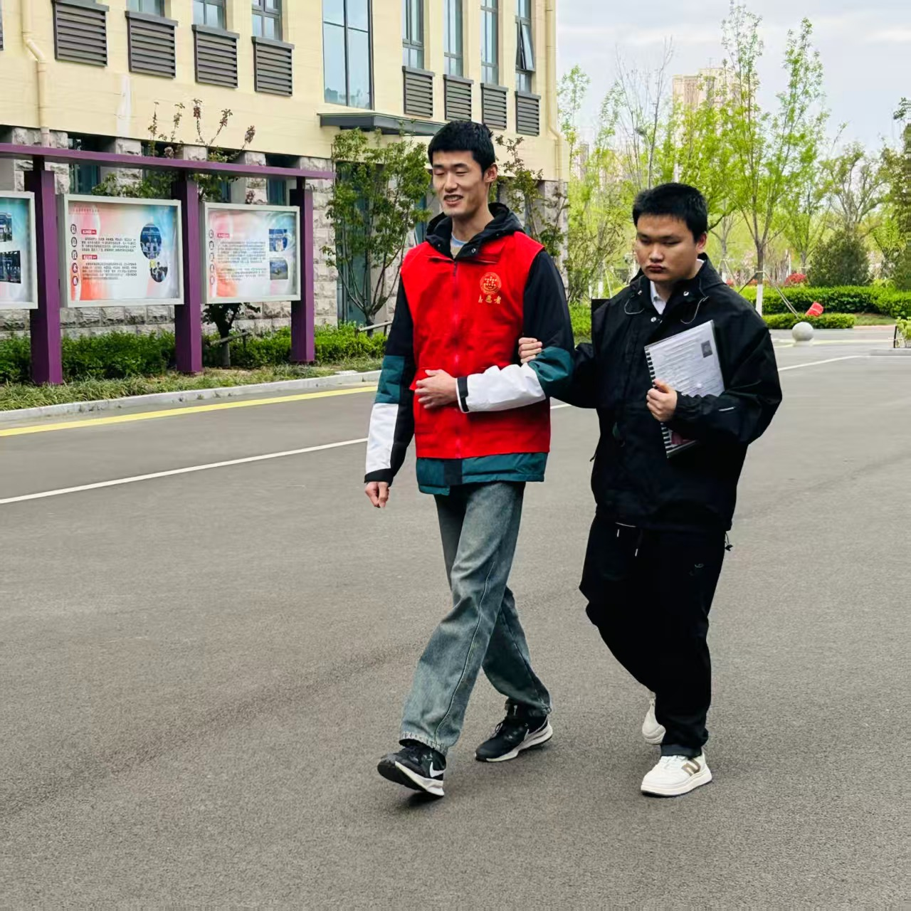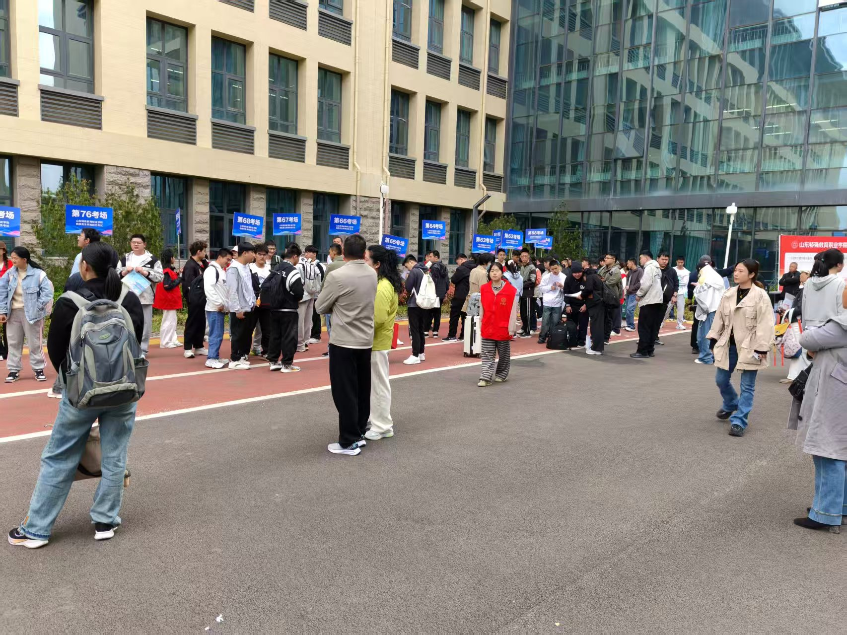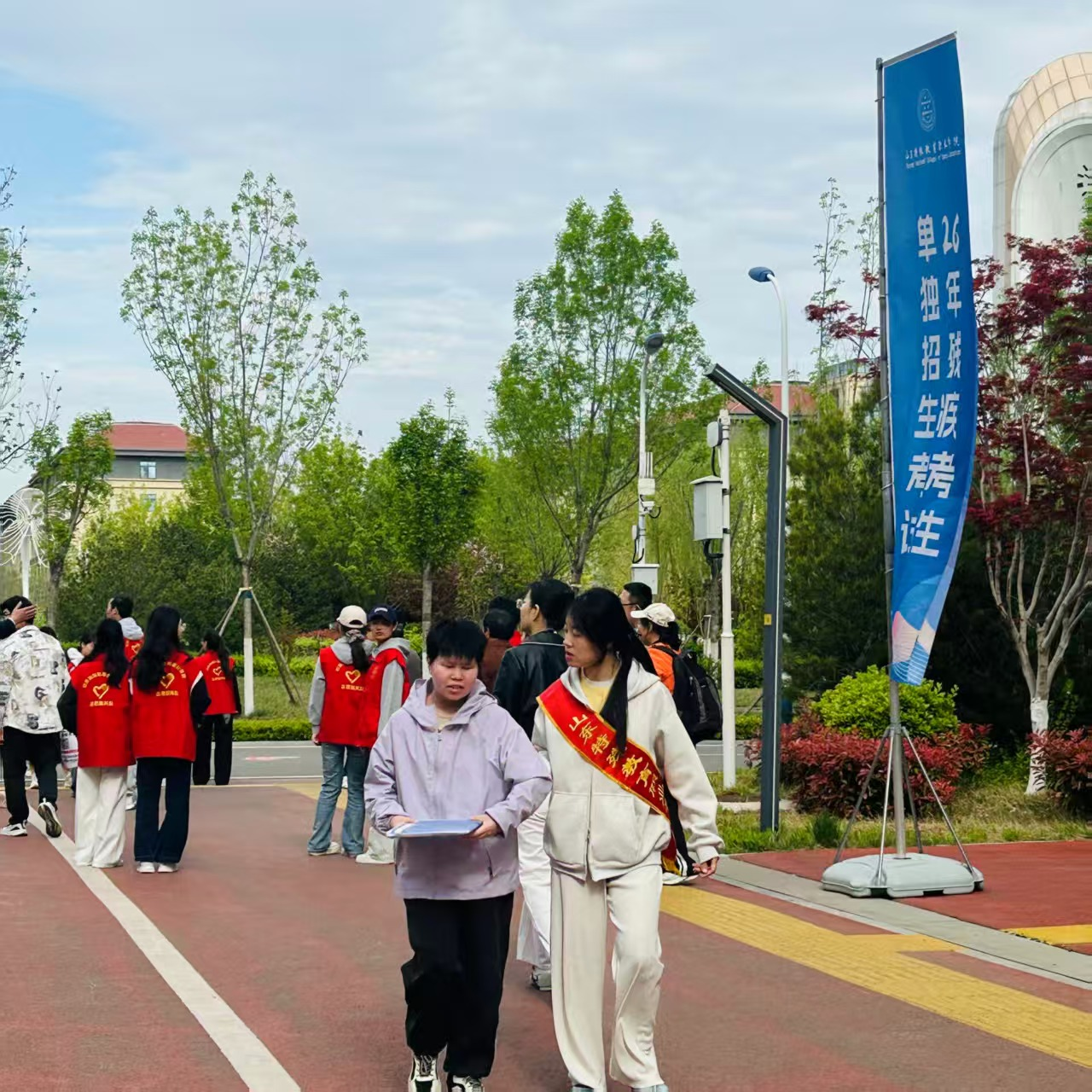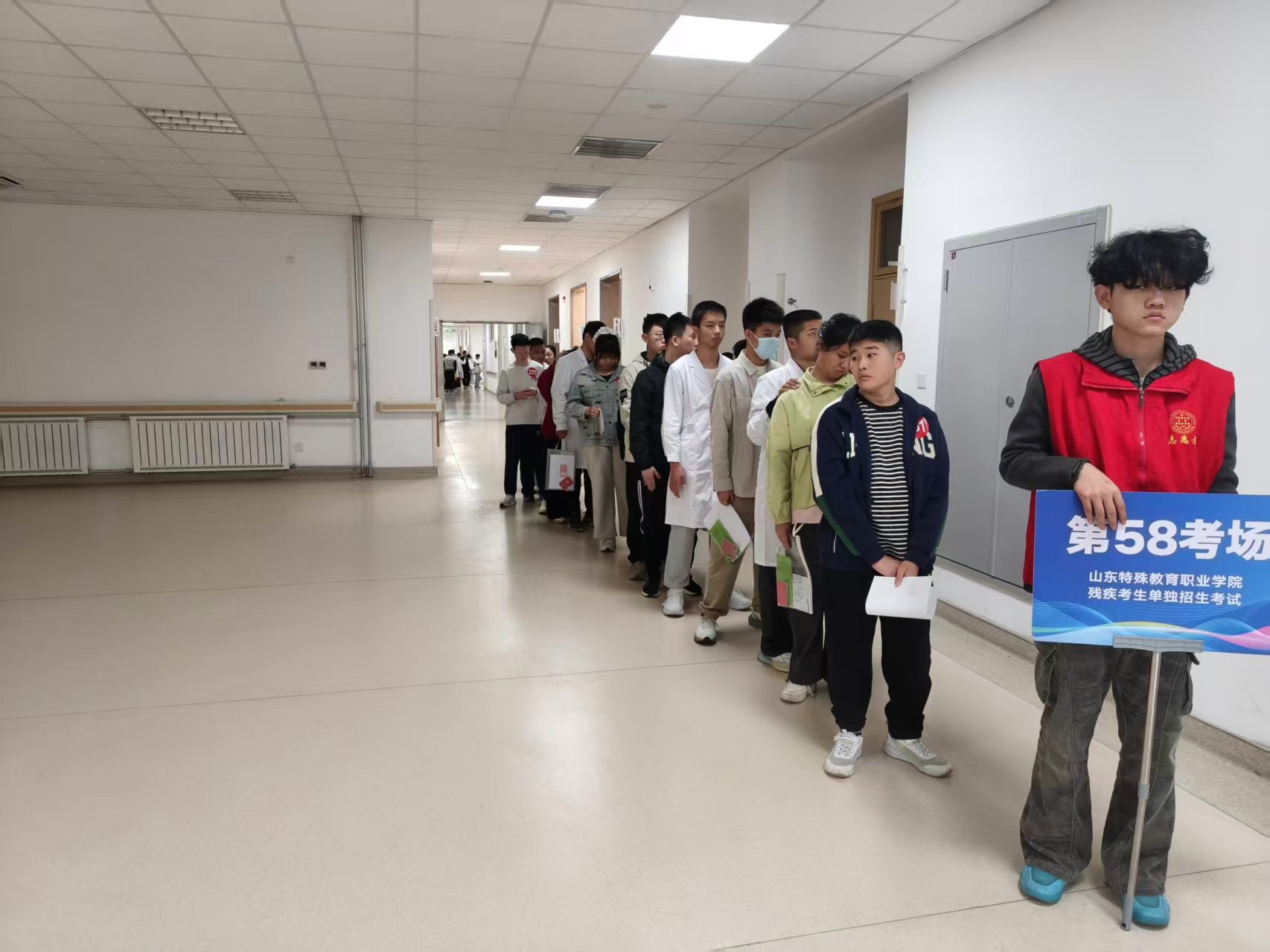 4月8日早7点20分,所有志愿者准时到岗、着装规范、有序就位。考生到达教学楼后,志愿者以考场为单位迅速组织队伍,逐一提醒考生带齐身份证、准考证等必要证件,并认真核对各考场实到人数。入场时,采取“一前一后”的引领方式,两名志愿者分别位于队伍前方与后方,既控制行进节奏,又确保视障考生无掉队、无磕碰,安全有序进入考场。上午考试结束后,再次以考场为单位统一带领考生离开考场,并逐一提醒下午集合时间,避免考生延误。