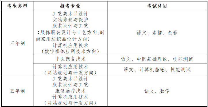 高中起点三年制:每个专业考1门文化课,2门专业课;其中中医康复技术、计算机应用技术(网站规划与开发)专业的2门专业课有1门为专业技能测试。文化课、专业课分值每门150分,总分450分。