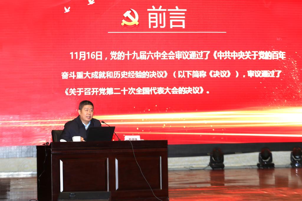 管洪锋围绕深刻认识总结党的百年奋斗重大成就和历史经验的重大意义,深刻认识党的百年奋斗的初心使命和重大成就,深刻认识中国特色社会主义新时代的历史性成就和历史性变革,深刻认识党的百年奋斗的历史意义和历史经验,深刻认识以史为鉴、开创未来的重要要求,从党的百年奋斗历程汲取智慧和力量,认真贯彻落实党的十九次六中全会精神等方面,对党的十九届六中全会召开的历史意义作深入分析,对党的百年奋斗重大成就和历史经验作精细解读,对全会和《中共中央关于党的百年奋斗重大成就和历史经验的决议》精神进行宣讲和阐释,并对学院进一步学习贯彻落实党的十九届六中全会精神作出部署。